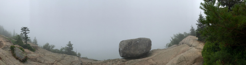 We enjoyed the summit and were amazed at how that rock just hangs perfectly in place at the edge. A little bit of Bubble Rock history... Bubble Rock was left here during the last Ice Age. Apparently, a glacier receded through here and this rock was left right at the precipice of the cliff. Although hiking Bubble Rock Trail had been enjoyable so far, the fog really limited our view of the surroundings. Instead of being disappointed, I decided to enjoy the uniqueness all around me. We scrambled around the granite formations, sat down to take in the "foggy views" and took some pretty nice pictures of the surrounding area in Acadia National Park.